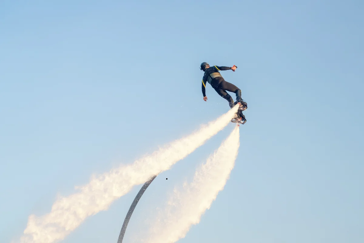 Flyboard es la actividad con el umbral más bajo entre esfuerzo y resultado visual: unos chorros de agua conectados a una moto acuática te elevan hasta 12 metros. No requiere titulación, no requiere forma física especial y el aprendizaje básico de mantenerse en el aire sin caer tarda entre 10 y 20 minutos. Los proveedores en Port Fòrum y Port Olímpic tienen modelos de sesión de 15-20 minutos desde 85-100 €. JetScoot opera desde Port Fòrum con versión de entorno controlado (“indoor flyboard” dentro del puerto) desde 69 €, con condiciones de mar independientes del viento.
