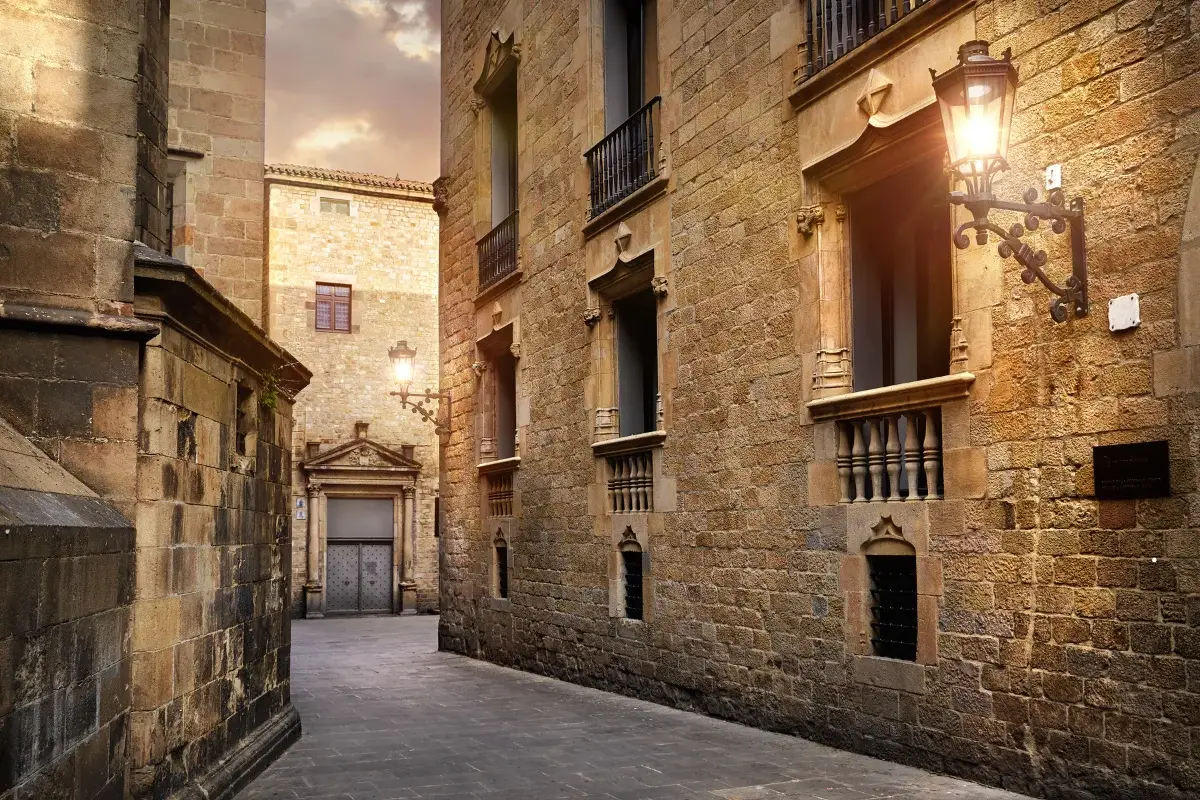 - Barrio Gótico — cruzando Las Ramblas, 5 minutos a pie